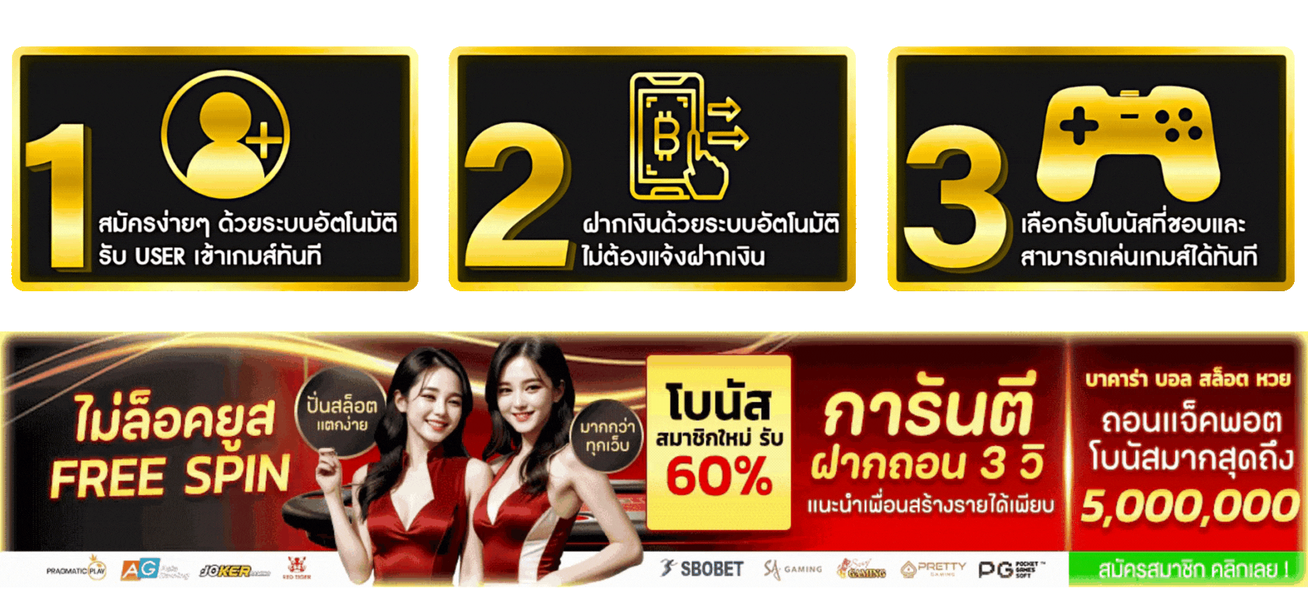 ตอบ : มีโบนัสต้อนรับสมาชิกใหม่ 100%, เครดิตฟรีไม่ต้องฝาก, คืนยอดเสีย 10% ทุกสัปดาห์ และกิจกรรมแจกเครดิตฟรีประจำเดือน